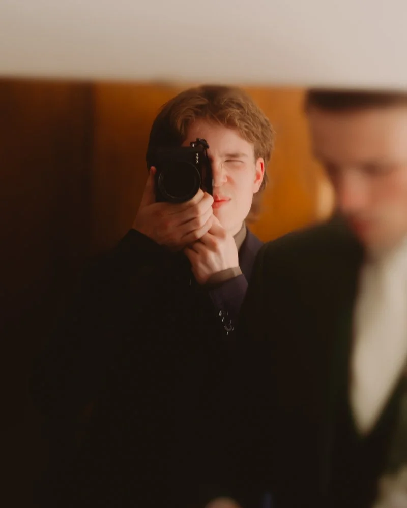 Een man met bruin haar neemt een foto van zichzelf via een spiegel, terwijl hij een andere persoon in de spiegel ziet.